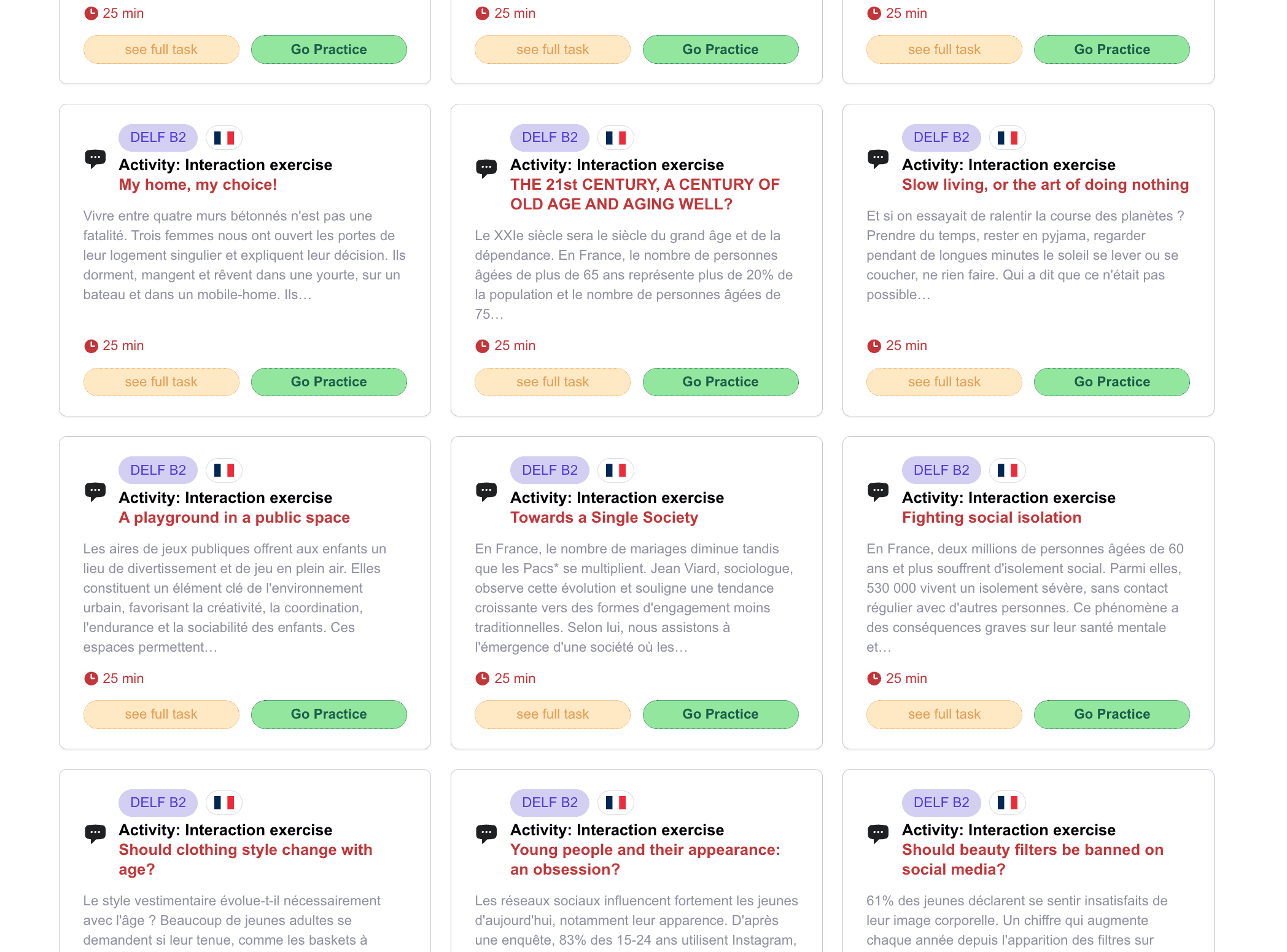 Prepare your exam quickly with hundreds of realistic model tests for DELF, TCF, DTZ, TELC and more — powered by AI.