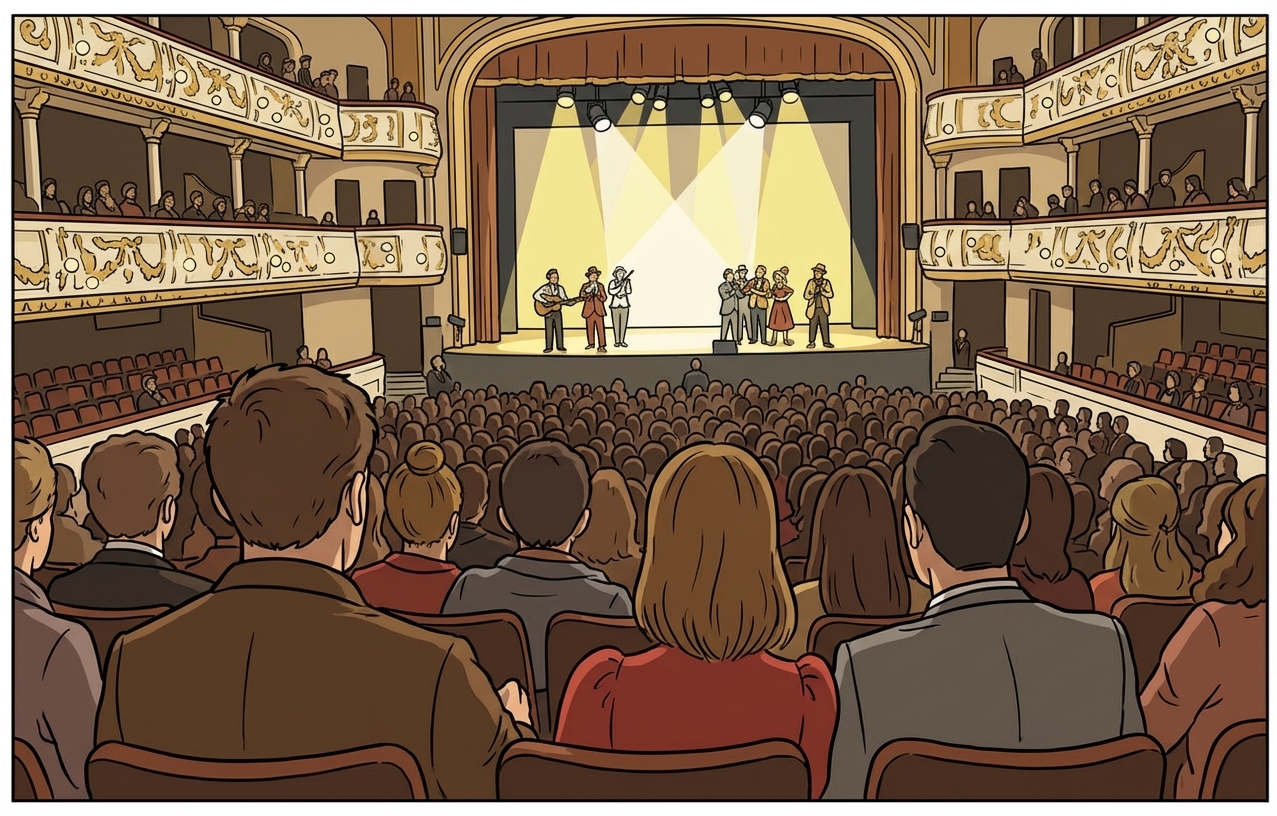 In this part of the exam I am going to give you two photographs. I would like you to talk about your photographs on your own for about a minute, and also to answer a question or two which I will ask you. Here are your photographs. They show people watching different kinds of live performances.